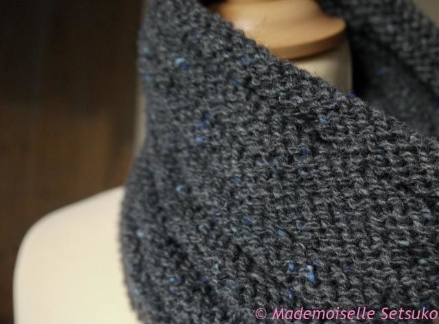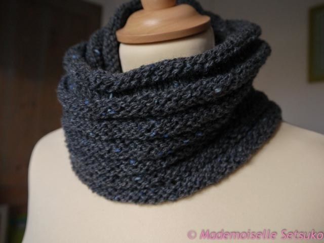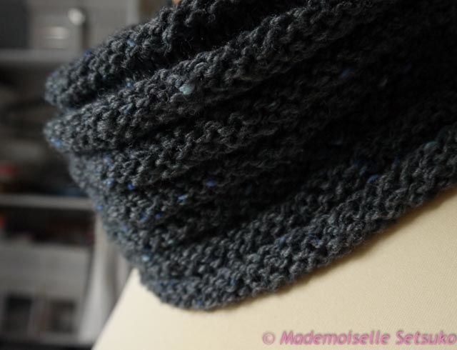 Snood monté sur 80 mailles en Soft tweed de Fonty, tricoté en aiguilles 5 avec une petite variante : 5 rangs endroit, 5 rang envers au lieu de 4 comme sur le modèle.