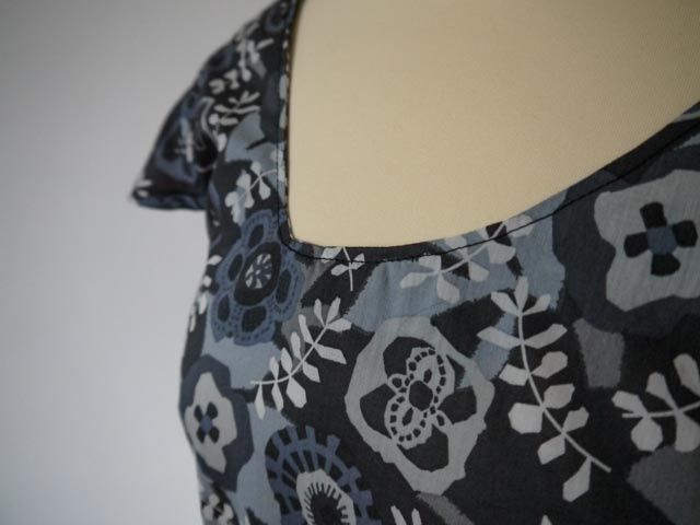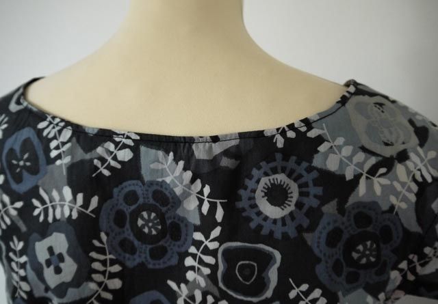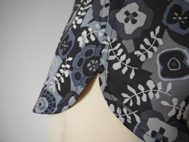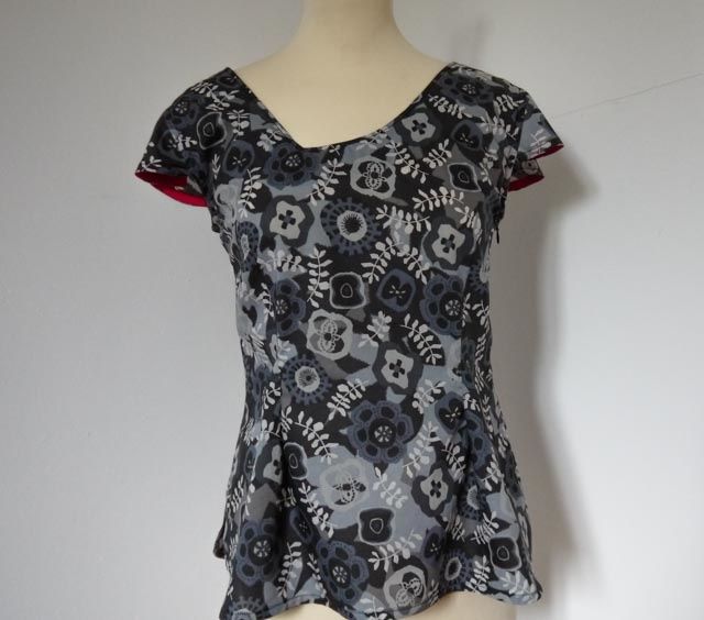 Version avec manches pour le top à encolure asymétrique et les détails habituels (découpes arrondies, surpiqûres, ouverture latérale).