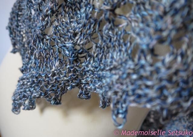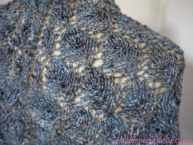 Petit coup d'oeil sur le deuxième ouvrage réalisé cet été : un petit châle ajouré tout simple tricoté en un temps record grâce à la taille des aiguilles.
